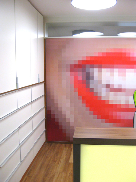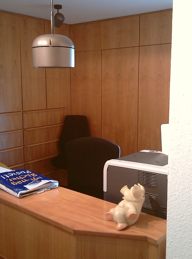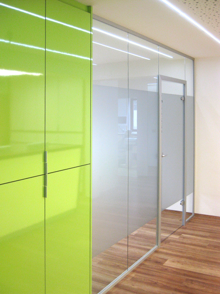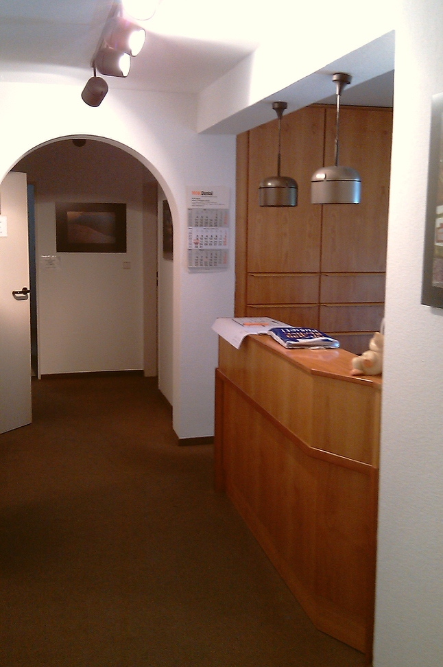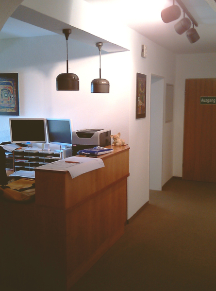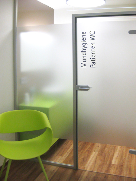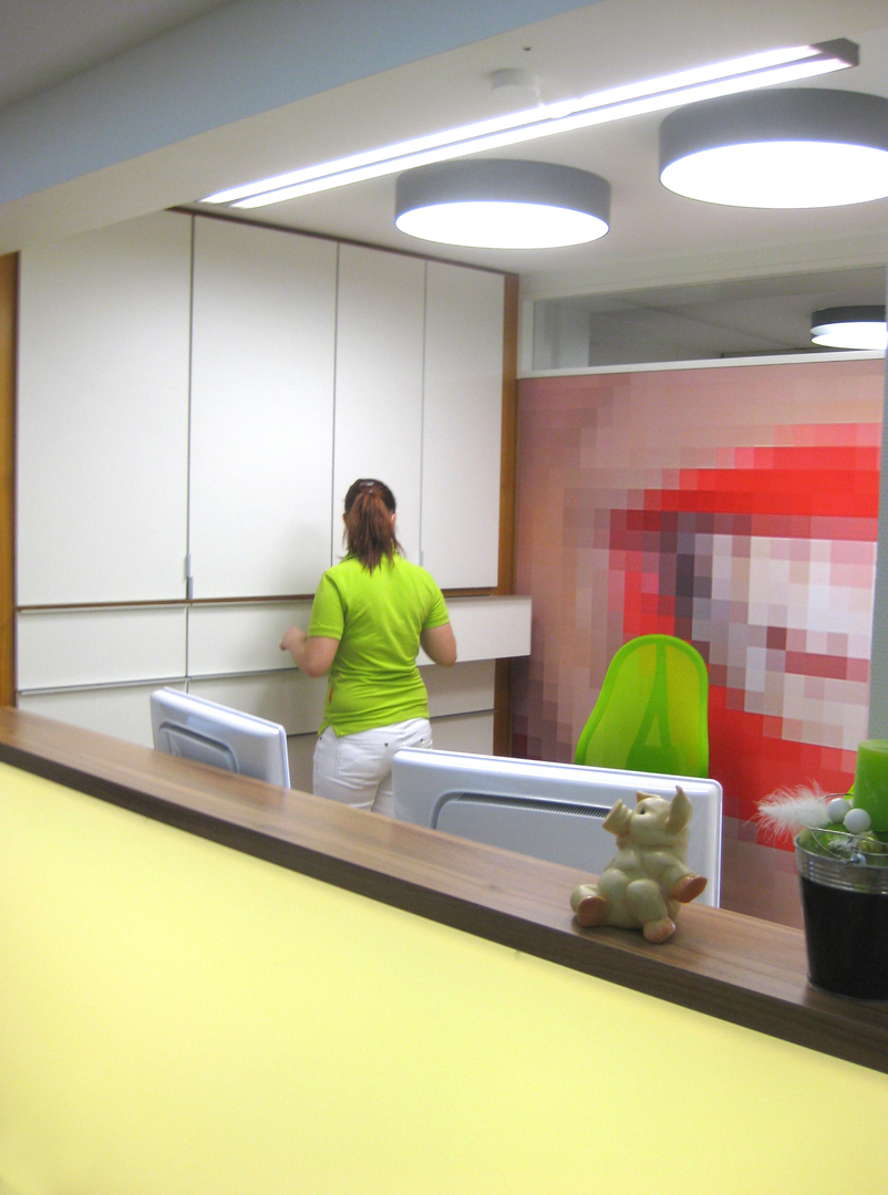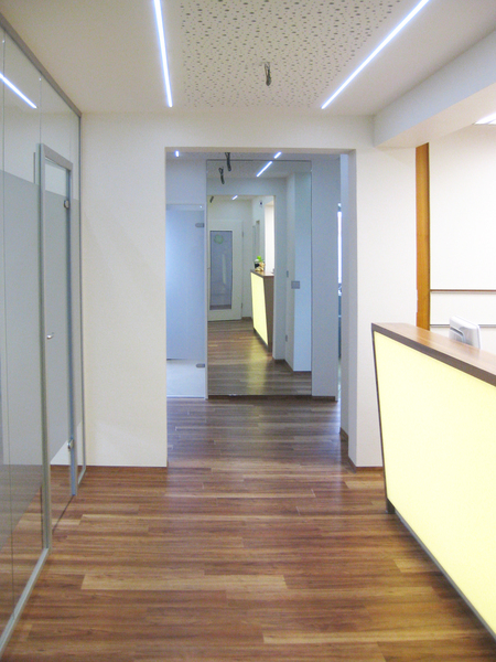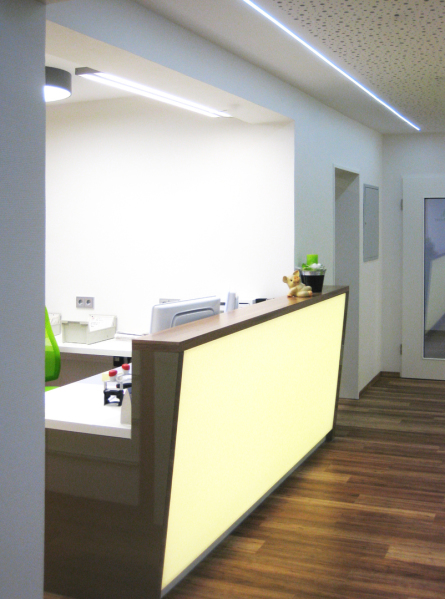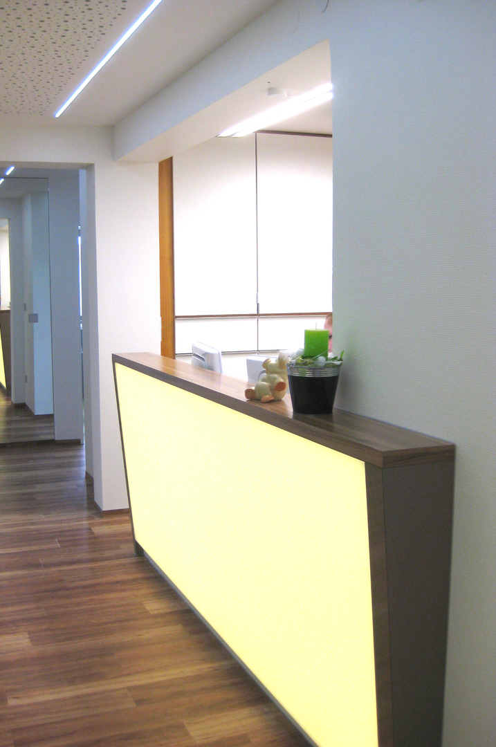 konzept der empfang wurde erneuert und dahinter begrüßt ein strahlendes lächeln die besucher. die leuchtende front sorgt für einen hellen, frischen eindruck. eine innenwand wurde entfernt und durch eine glaswand-stauraum-kombination ersetzt. jetzt bekommen die innen liegenden räume mehr licht. die ganze praxis erscheint heller, frischer und geräumiger. |